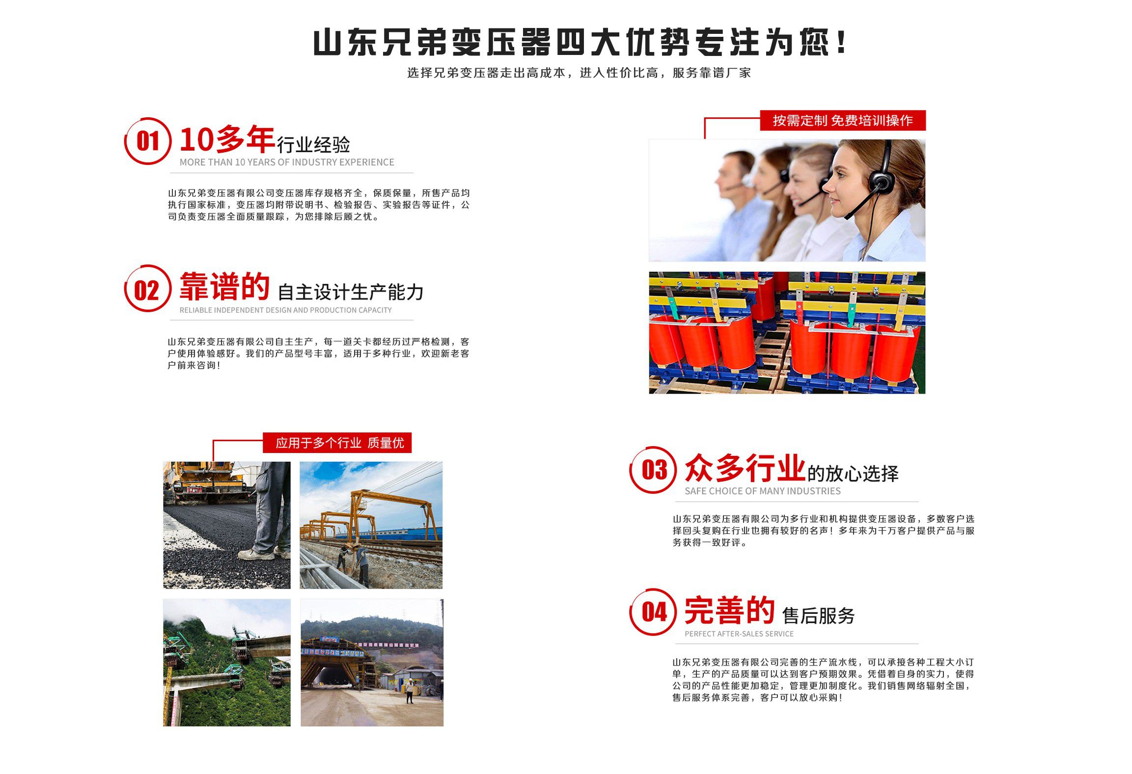 山東兄弟變壓器有限公司經營SCB10干式變壓器,SCB11干式變壓器價格,SCB12變壓器,SCB13干式變壓器,SCB14干式變壓器,SCB18干式變壓器等產品及用戶要求的特殊變壓器?! 」镜馁|量方針是:“顧客的滿意,是我公司的追求。”堅持質量,用戶至上,以質興業,以優取勝,愿為廣大用戶設計各種要求的變壓器,以求共同發展。 企業精神:“創新、求實、誠信、高效”?! ∑髽I作風:“嚴、細、實、快”。 企業工作方針:“加強內部管理,夯實基礎,全面提高職工整體素質,使企業管理水平再上新的臺階”?! 」?..